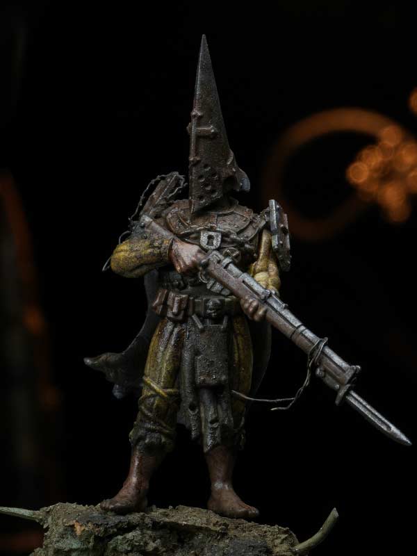 A conical helmet reminiscent of the headgear of the penitents. Blessed by the Church and often containing a fragment of a relic, Iron Capirotes shield their wearers from the psychological horror of war, enabling them to face creatures from the pits of Hell unflinchingly.