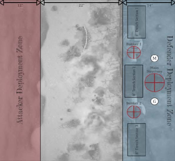 The Defender places three 8”-long Trench sections in their Deployment Zone. They can be placed as the Defender wishes and can be continuous. However, in the division between each of the three trench sections the Defender must place a bunker model (as indicated by the small Red Markers on the map) of at least 4” x 4” and up to 3” high, so that models of up to 75mm tall may enter the bunker’s interior.