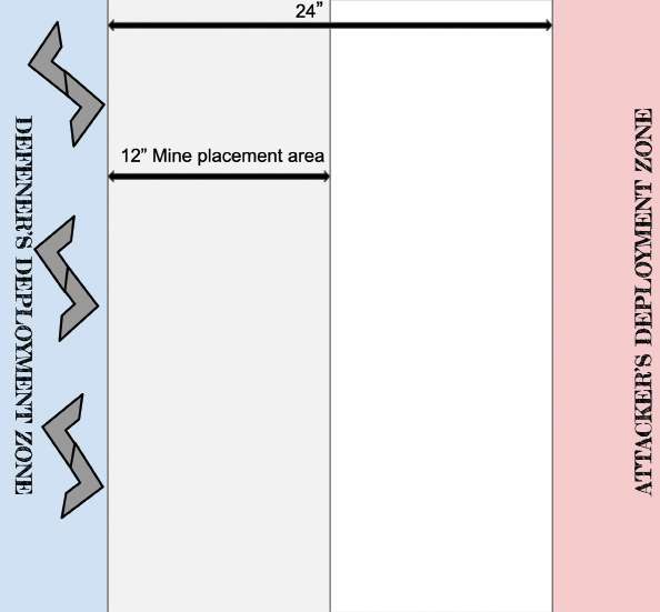 The Defender places three 8”-long Trench sections in their Deployment Zone. They can be placed as the Defender wishes and can be continuous, but each section always counts separately for Victory Points (see below).Mines