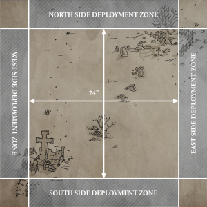 The players roll-off. The winner of the roll-off chooses whether the West or East Deployment Zone will be theirs. The players must then split their Warbands into two groups of models. The first group is the starting group, and the second group is their reinforcements. There must be more models in the starting group, and any models mounted on bases of 40mm or larger must be part of the starting group.