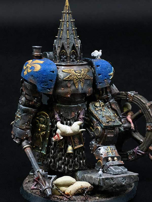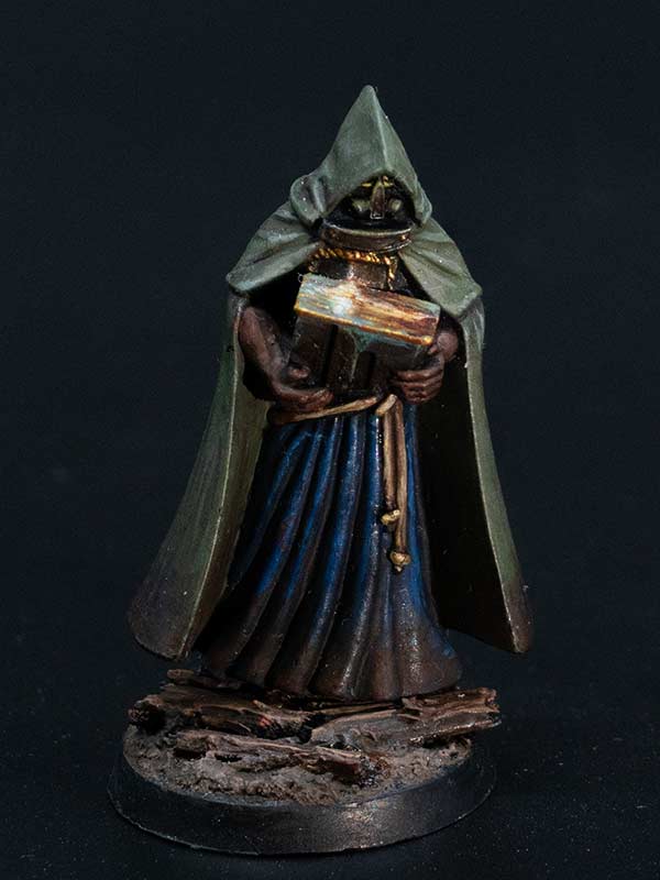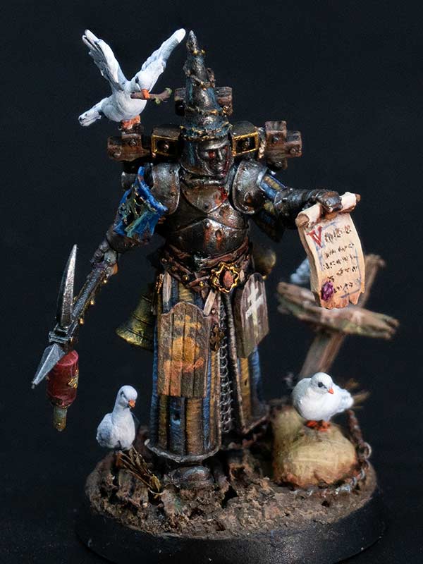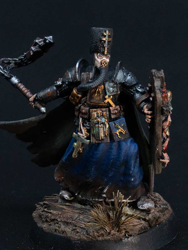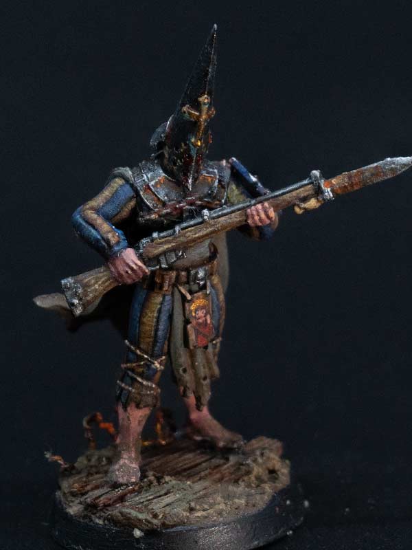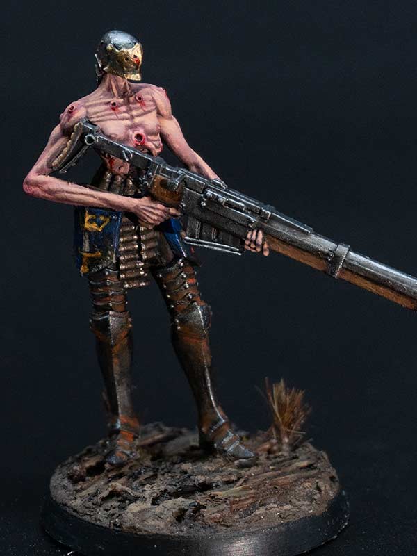 Trench Pilgrims of the Procession of the Sacred Affliction are known for their zeal in close-quarter combat, their armour decorated with icons and shields adorned with the depictions of the Saints, which, despite appearances, can withstand machine gun bullets. The millstones they carry upon their backs are used to tie about the necks of sinners before drowning them in the mud and blood of No Man’s Land. They spurn the use of the iron capirotes, believing firmly that faith alone is enough to withstand the horrors of Hell.